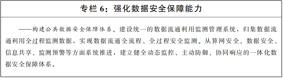(十九)提升數(shù)據(jù)安全保障能力。加強(qiáng)公共數(shù)據(jù)可信采集、加密傳輸、可靠存儲、受控交換共享、實時分析、智能應(yīng)用、銷毀確認(rèn)及存證溯源等環(huán)節(jié)的安全技術(shù)支撐,有效規(guī)避數(shù)據(jù)隱私泄露、違規(guī)濫用等風(fēng)險。推動“數(shù)盾”體系試點示范工程建設(shè),提升數(shù)據(jù)匯聚關(guān)聯(lián)風(fēng)險識別和管控水平。培育數(shù)據(jù)流通安全檢測、評估、審計、公證等第三方專業(yè)服務(wù)機(jī)構(gòu),壯大數(shù)據(jù)安全治理服務(wù)規(guī)模,提升安全服務(wù)效能。探索運用數(shù)據(jù)沙箱等技術(shù),構(gòu)建鼓勵創(chuàng)新、彈性包容的治理環(huán)境。