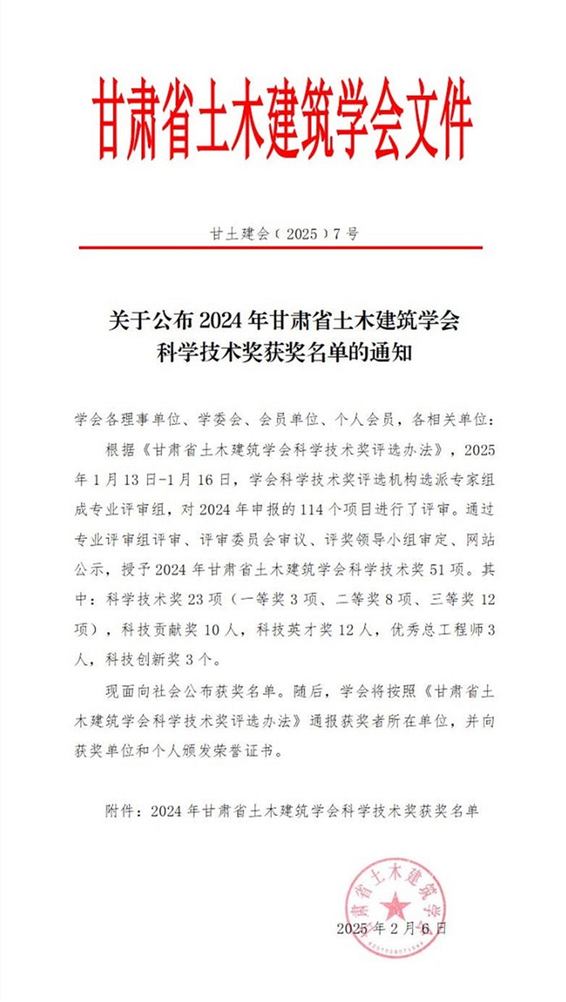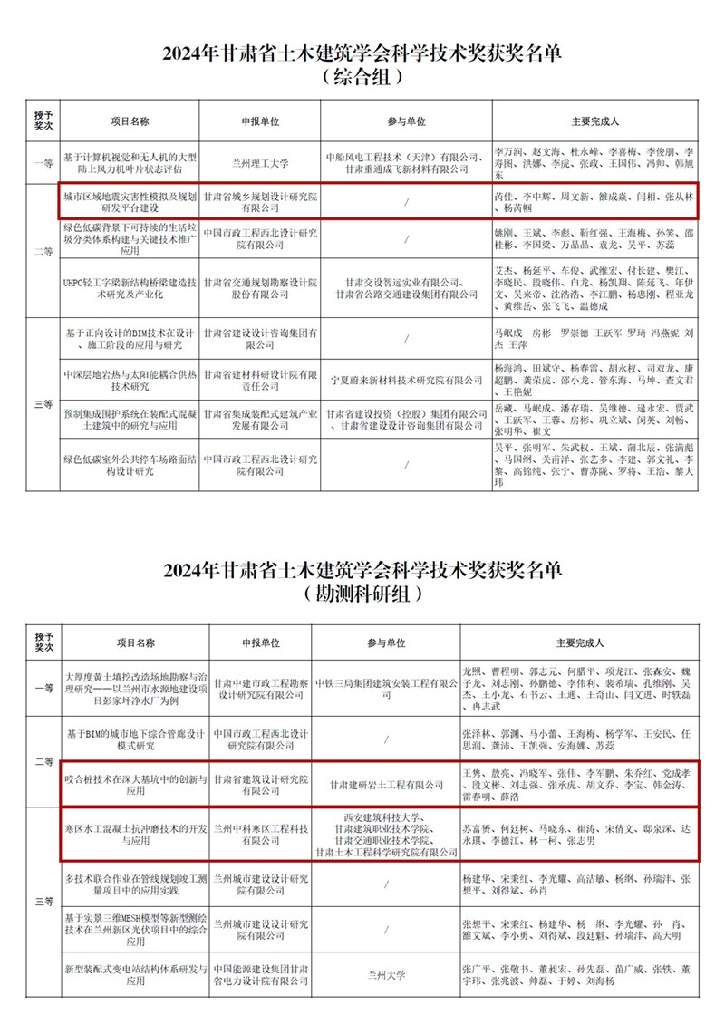 近日,2024年甘肅省土木建筑學(xué)會科學(xué)技術(shù)獎獲獎結(jié)果公布,甘肅工程咨詢集團(tuán)斬獲多項(xiàng)榮譽(yù)。其中,省建筑設(shè)計(jì)院申報的《咬合樁技術(shù)在深大基坑中的創(chuàng)新與應(yīng)用》項(xiàng)目榮獲“科學(xué)技術(shù)獎(勘測科研組)二等獎”,省城鄉(xiāng)規(guī)劃院申報的《城市區(qū)域地震災(zāi)害模擬及規(guī)劃研發(fā)平臺建設(shè)》項(xiàng)目榮獲“科學(xué)技術(shù)獎(綜合組)二等獎”,土木工程院參與的《寒區(qū)水工混凝土抗沖磨技術(shù)的開發(fā)與應(yīng)用》項(xiàng)目榮獲“科學(xué)技術(shù)獎(勘測科研組)三等獎”。省建筑設(shè)計(jì)院、省城鄉(xiāng)規(guī)劃院4人分別榮獲“科技貢獻(xiàn)獎”“科技英才獎”“科技貢獻(xiàn)獎”“優(yōu)秀總工程師獎”等榮譽(yù)稱號。