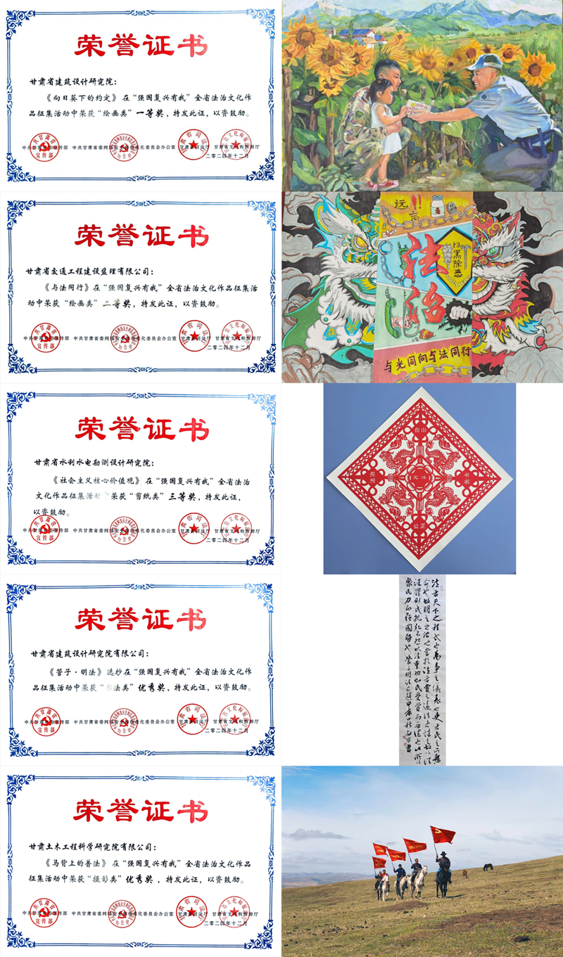 經(jīng)評選,集團(tuán)多件作品脫穎而出。省建筑設(shè)計(jì)院的《向日葵下的約定》以細(xì)膩筆觸和獨(dú)特視角,獲繪畫類一等獎(jiǎng);省交通監(jiān)理公司的《與法同行》生動(dòng)展現(xiàn)法治守護(hù),獲繪畫類二等獎(jiǎng);省水電設(shè)計(jì)院的《社會(huì)主義核心價(jià)值觀》以精湛剪紙技藝,獲剪紙類三等獎(jiǎng);省建筑設(shè)計(jì)院的《〈管子·明法〉選抄》獲書法類優(yōu)秀獎(jiǎng);甘肅土木工程院的《馬背上的普法》獲攝影類優(yōu)秀獎(jiǎng)。