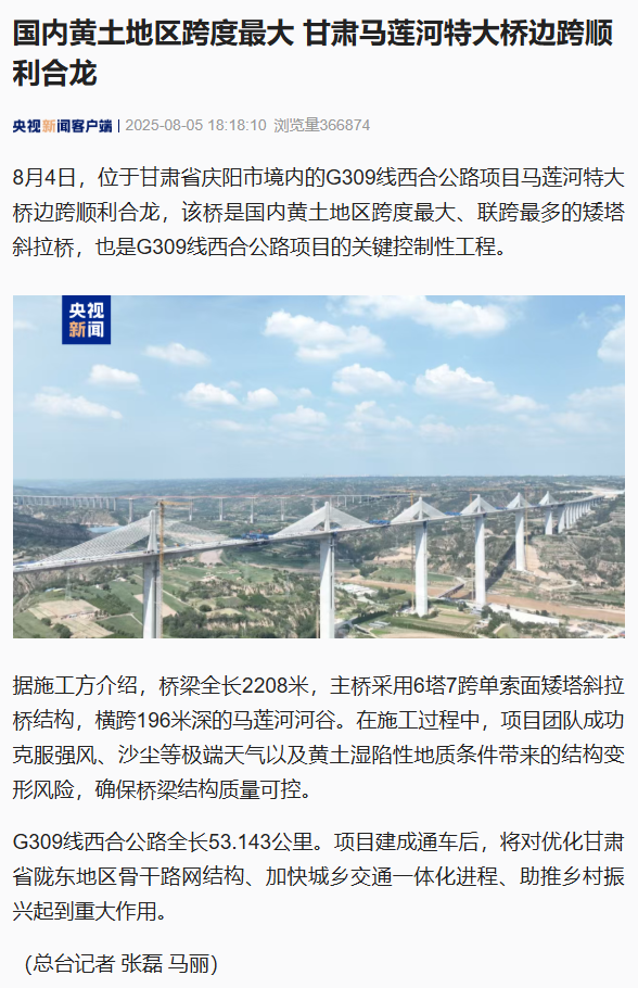 甘肅工程咨詢集團(tuán)監(jiān)理項(xiàng)目取得重大突破:國(guó)內(nèi)黃土地區(qū)跨度最大 甘肅馬蓮河特大橋邊跨順利合龍