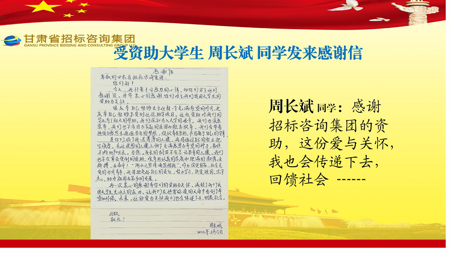 近日,張家川縣張棉驛鄉(xiāng)張棉村貧困大學(xué)生代表劉國(guó)熙、周長(zhǎng)斌、李雪峰等向甘肅省招標(biāo)咨詢集團(tuán)有限責(zé)任公司發(fā)來感謝信,就招標(biāo)咨詢集團(tuán)給予學(xué)費(fèi)資助一事表達(dá)他們的感激之情。