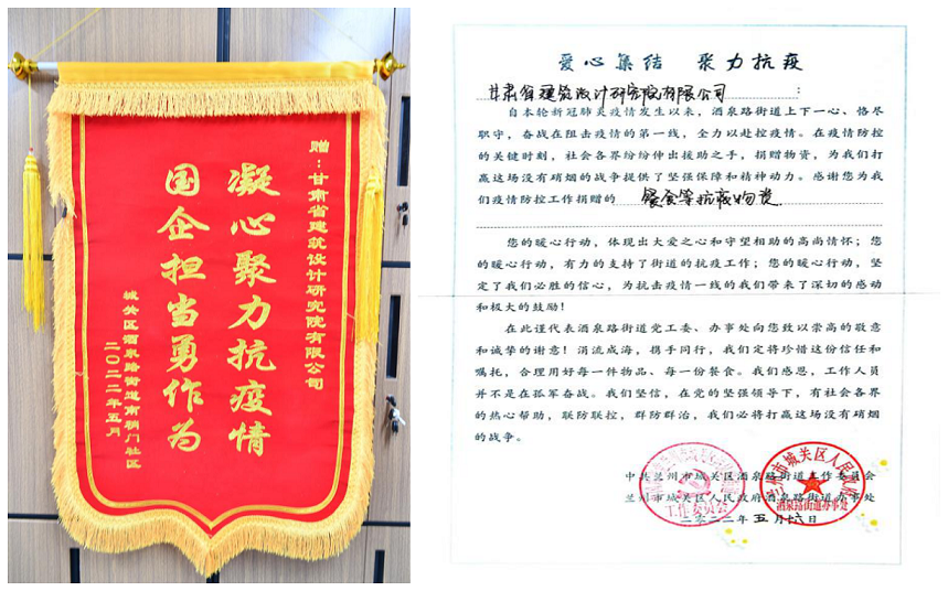 5月16日,甘肅省建筑設(shè)計研究院有限公司收到了來自蘭州市城關(guān)區(qū)酒泉路街道送來的感謝錦旗,錦旗上書寫著“凝心聚力抗疫情 國企擔(dān)當(dāng)勇作為”。建筑設(shè)計院黨委書記李向軍、總經(jīng)理曹慶、紀(jì)委書記丁永升及黨群工作部相關(guān)負(fù)責(zé)人接待來訪。