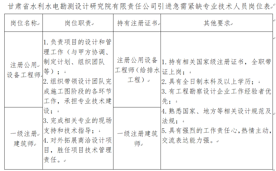 本次引進的具體崗位及資格條件詳見《甘肅省水利水電勘測設計研究院有限責任公司引進急需緊缺專業(yè)技術人員崗位表》(附件1)。